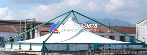 首先,對污水池加蓋處理,采用抗腐蝕性強的PVDF膜材,鋼結(jié)構(gòu)在外面懸掛的方式,既發(fā)揮了氟碳纖維膜的抗腐蝕性能,又避免了鋼結(jié)構(gòu)與腐蝕性氣體的接觸,延長了鋼結(jié)構(gòu)的使用年限;