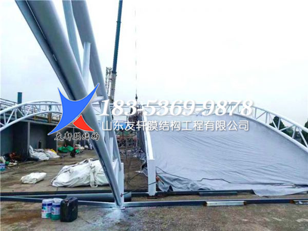 首先,對(duì)污水池加蓋處理,采用抗腐蝕性強(qiáng)的PVDF膜材,鋼結(jié)構(gòu)在外面懸掛的方式,既發(fā)揮了氟碳纖維膜的抗腐蝕性能,又避免了鋼結(jié)構(gòu)與腐蝕性氣體的接觸,延長(zhǎng)了鋼結(jié)構(gòu)的使用年限;